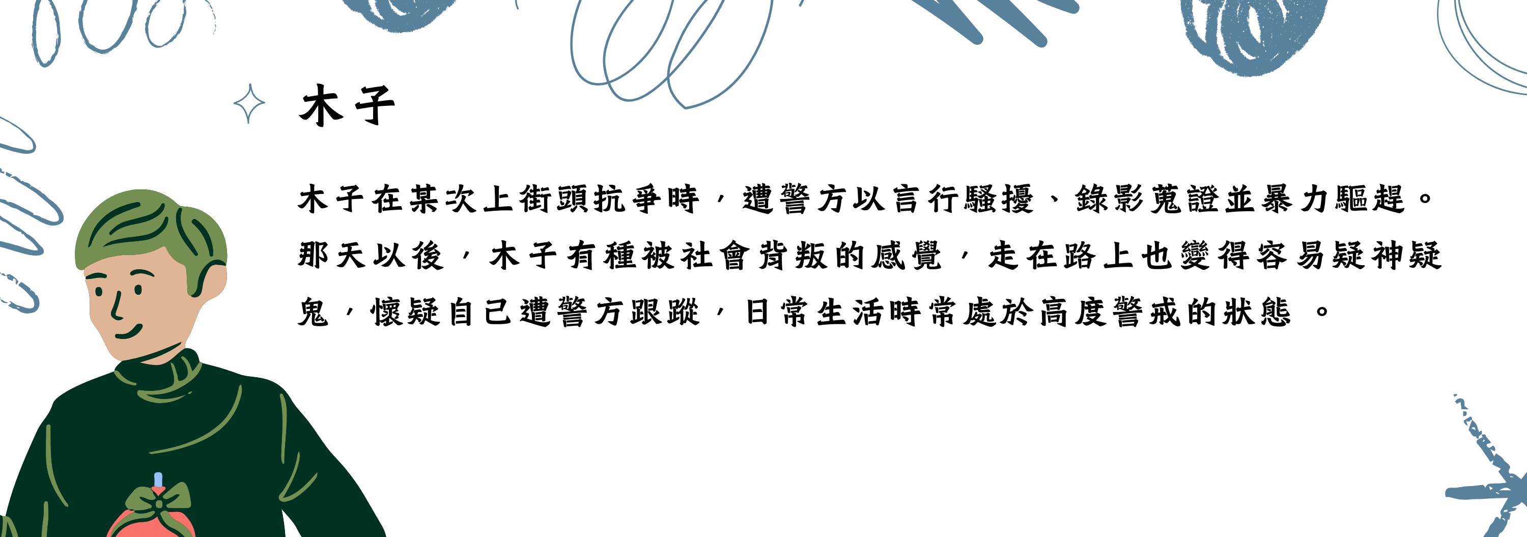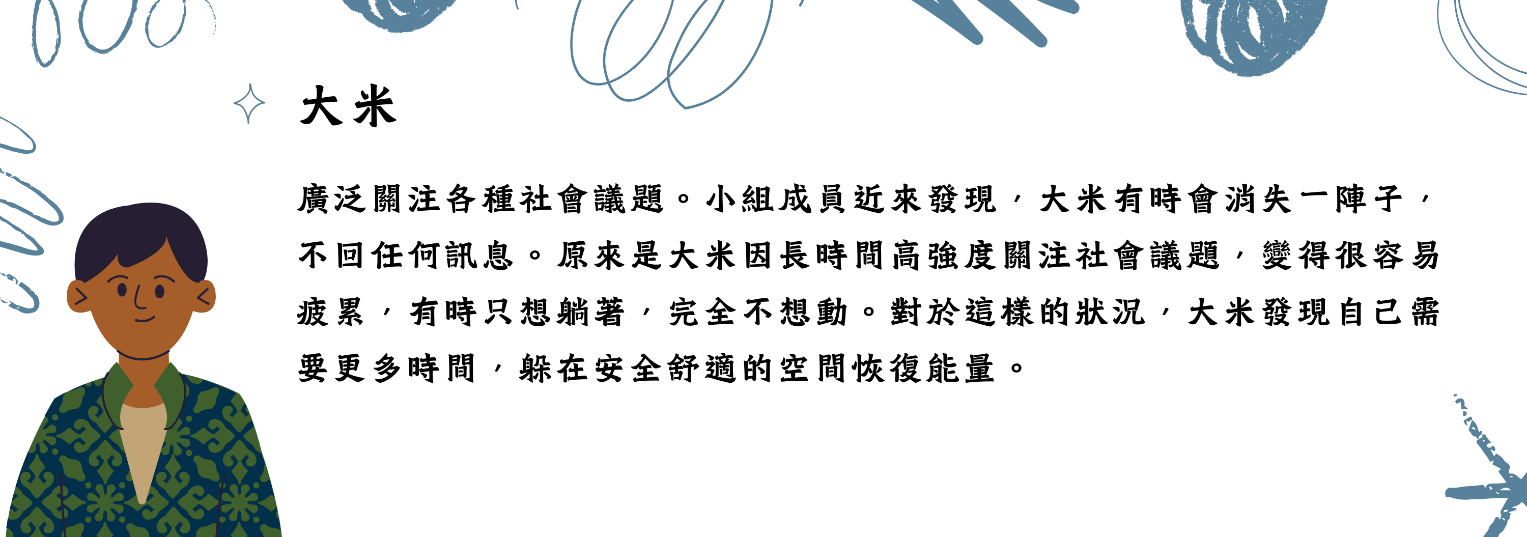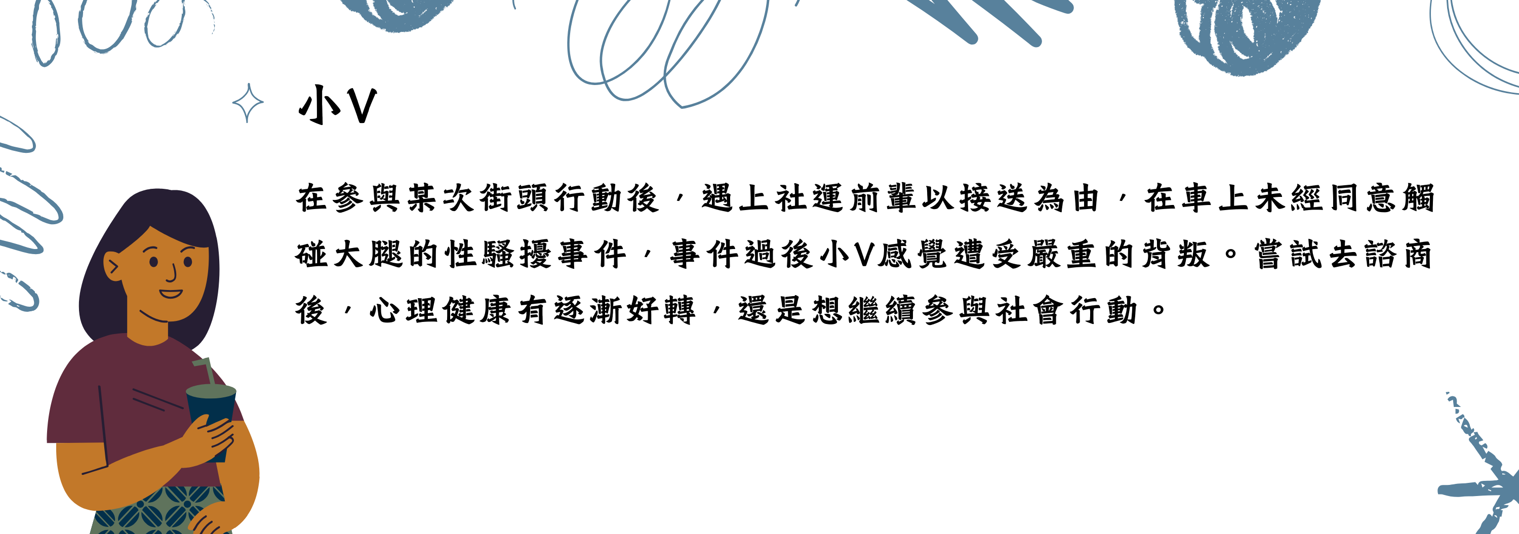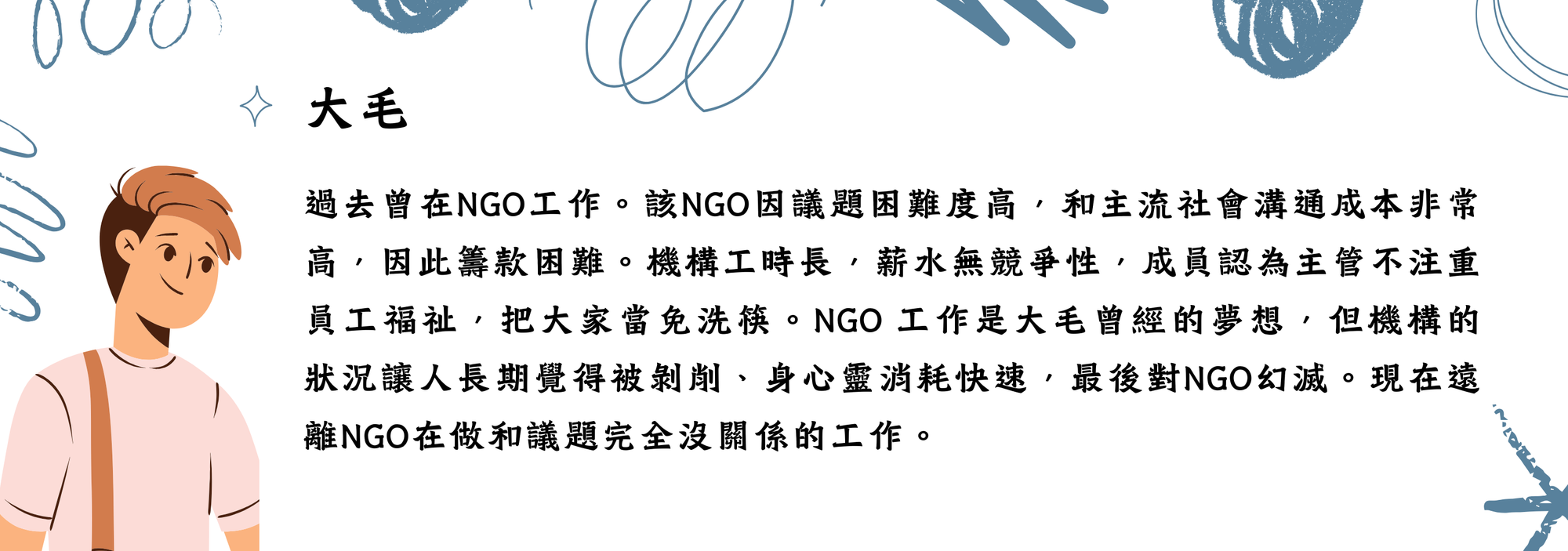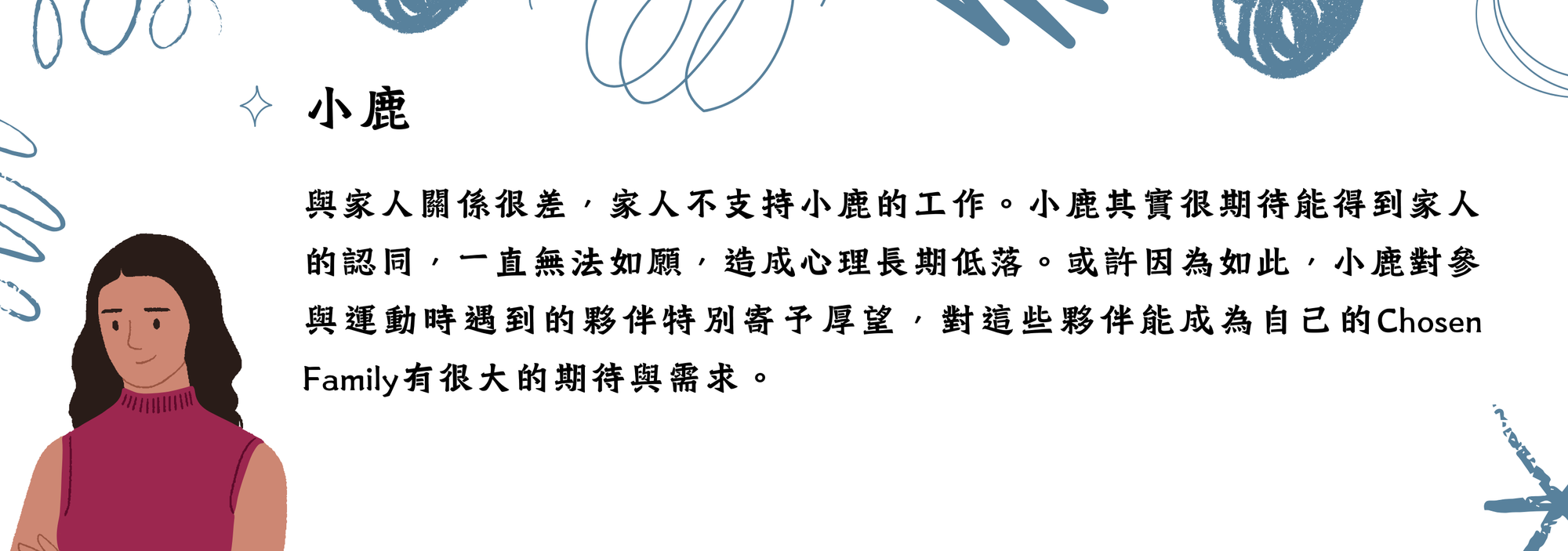 這些角色不指向任何實際案例,但這些人物設定也並非憑空產生。相信從事議題相關工作的任何人,都可能在某時某刻會對這些虛構人物的遭遇深感共鳴。讓我們一起繼續探索吧!