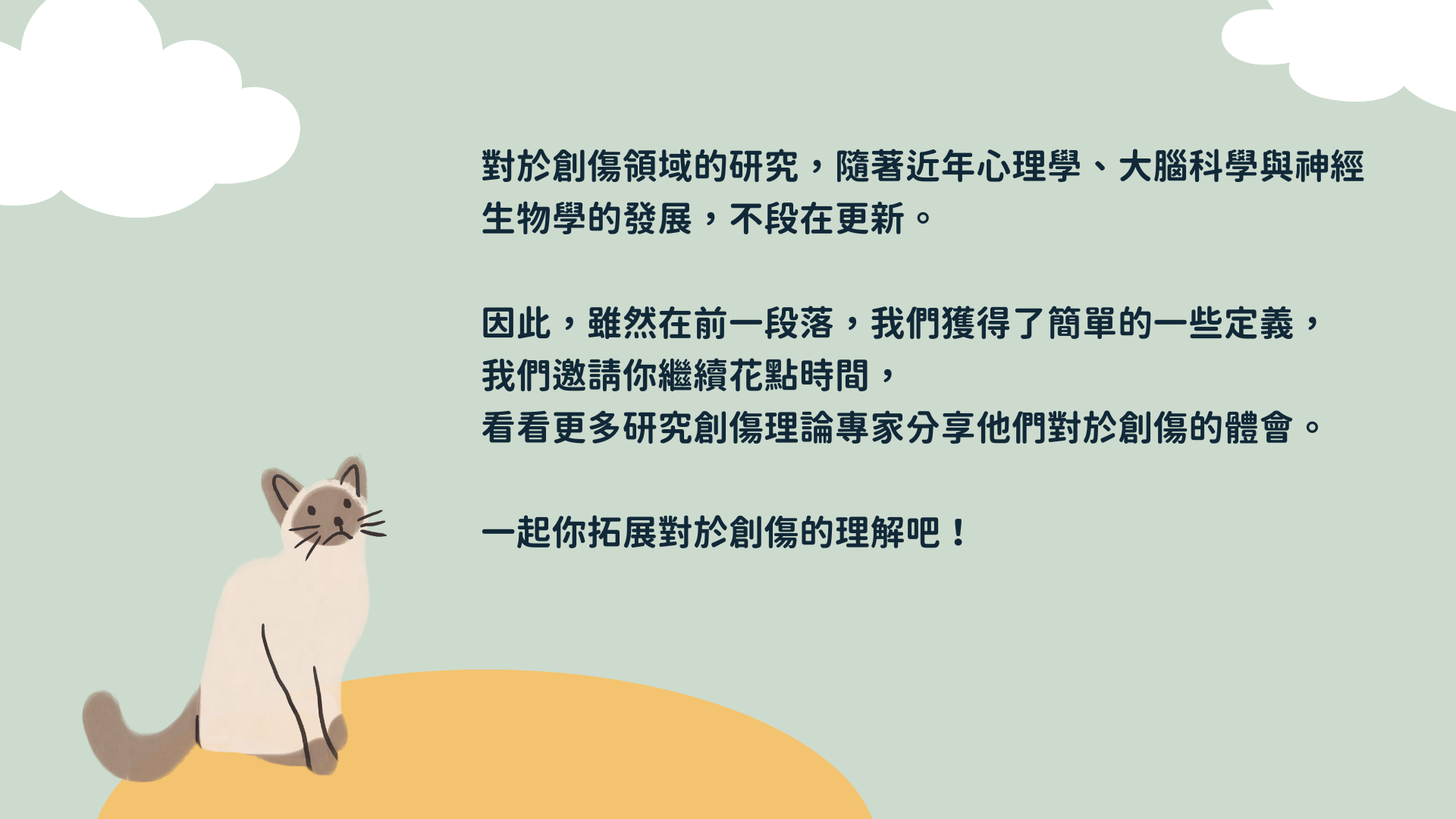 它能協助你在任何教學或臨床工作時預設創傷的存在。