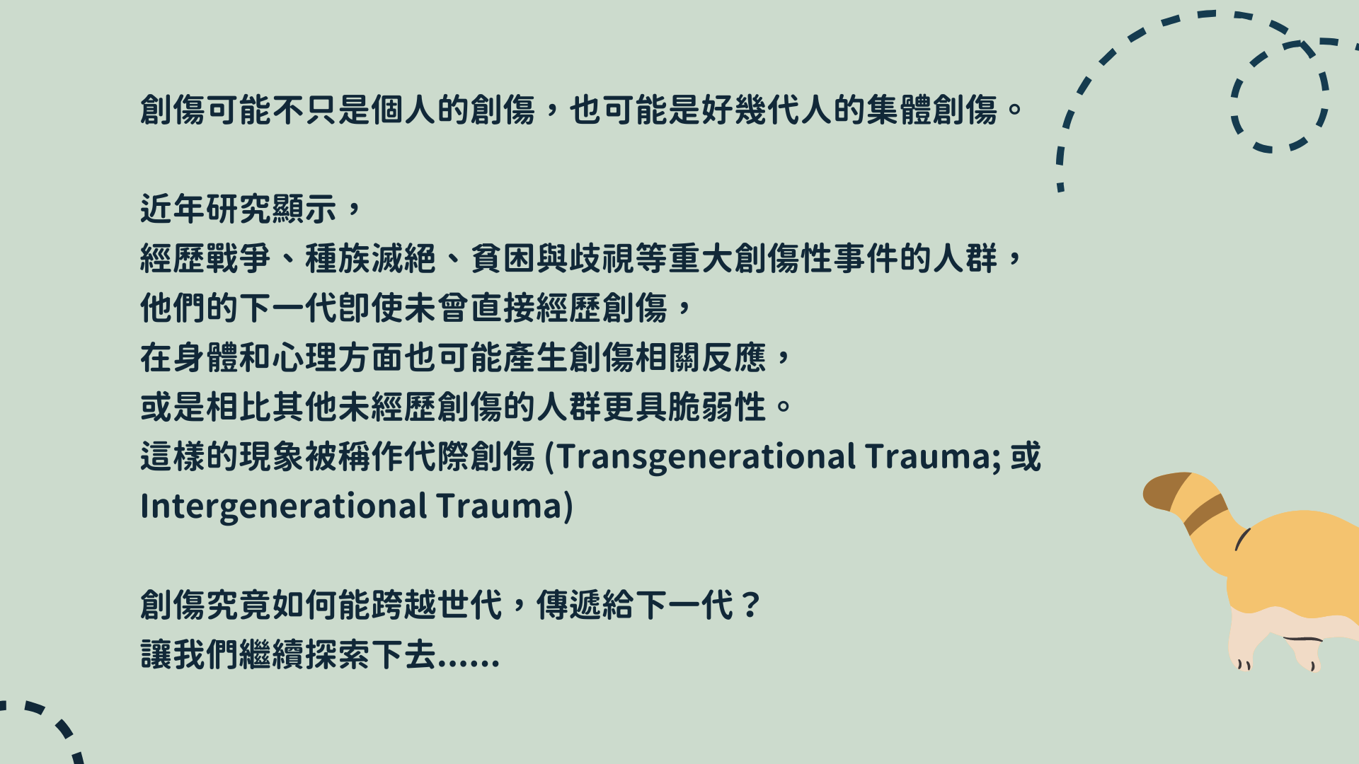 接下來是集體創傷,即跨世代創傷,跨世代創傷就是創傷從一代傳到下一代。